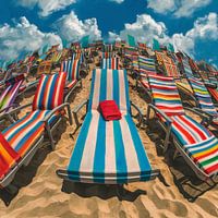 Handdoek op het strand - de zomer begint. digitale kunst. De kunstenaar heeft deze afbeelding gemaakt met behulp van kunstmatige-intelligentietechnologie en geoptimaliseerd met een beeldbewerkingsprogramma.