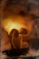 Twee kleine zwammetjes verscholen zich achter een blad en dromen van een reis over het grote water naar de zon.