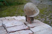 opgestapelde bakstenen en oude bouwhelmen op een bouwplaats