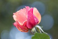 close up van een oranje roze roos, met een blauw groene bokeh achtergrond door het zonlicht