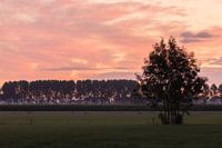 landschap met een boom op de weide, in de vroege ochtend wanneer de zon opkomt en de wolkenlucht prachtig oranje kleurt