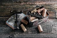 oude kurkentrekker met tin en wijnkurk op houten achtergrond, studiofotografie