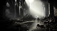 Oude donkere gebouwen rijzen op als getuigen van een voorbije glorie, hun gevels doorweven met het web van de tijd. De stenen dragen littekens van eeuwen, vertellen verhalen van triomfen en tragedies gefluisterd door de wind die door de verlaten gangen waait. Torens steken trots uit boven het landschap, als spitsen van weemoedige herinneringen.