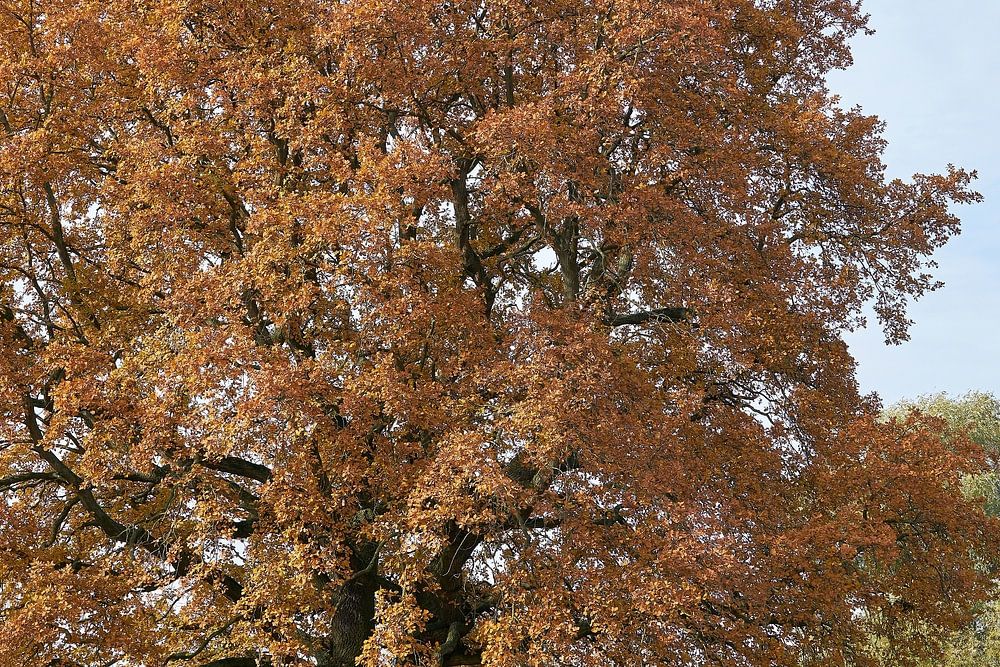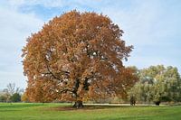 oude zomereik, Quercus robur, met herfstverkleuring, in het Wiesenpark, het noordelijke deel van het Herrenkrugpark aan de rivier de Elbe bij Maagdenburg in Duitsland.