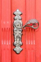 Een oude gesmede deurklink siert een helderrode houten deur