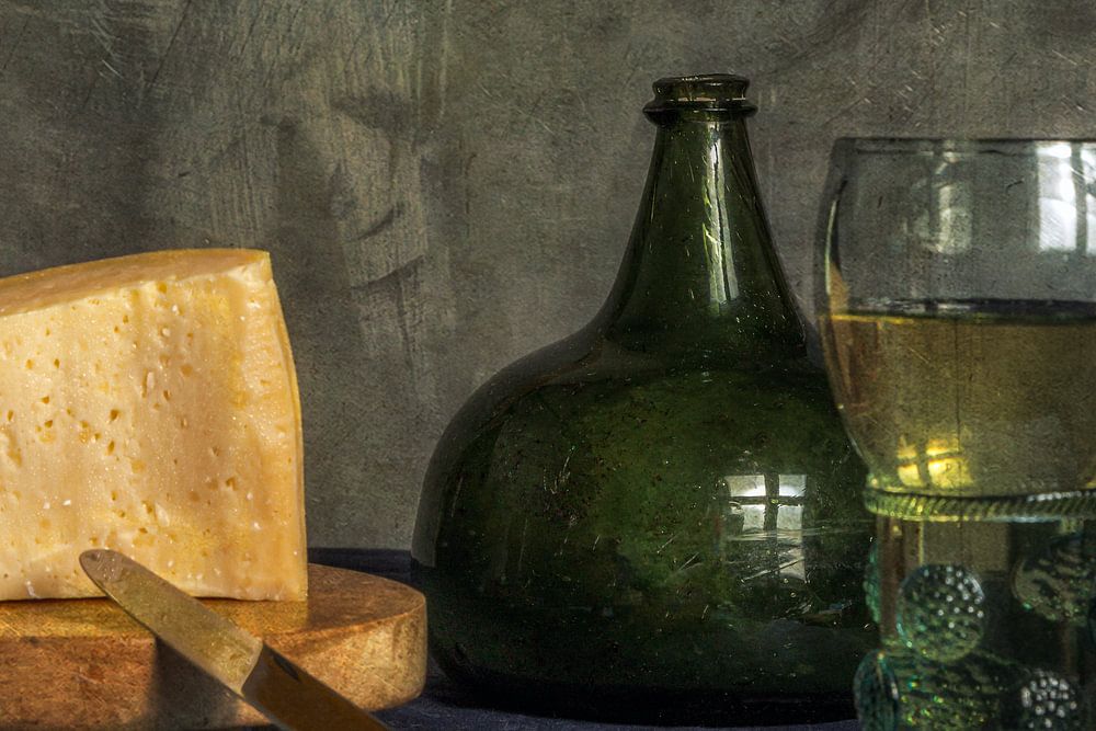 Een klein houten plateau met een stuk oude kaas en een mes om de kaas te snijden. De uit de 17e eeuw stammende kattekop wijnfles is leeg maar de roemer daarentegen is net gevuld. Het geheel is gesitueerd op de zijkant van de tafel en de kleden op de tafel zijn licht- en donkerbauw wat een mooie kleur gradatie geeft.