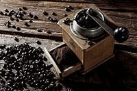 Antieke koffiemolen met bonen en poeder op rustieke houten achtergrond, studio-opname