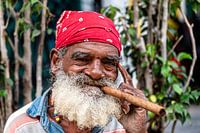 Fotoportret oude man met baard en sigaar in Havana Cuba