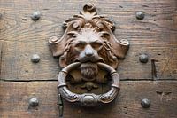 Over ‘oude metalen deurklopper als leeuwenkop op een rustieke houten deur in italië’ van Maren Winter