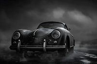 Op de zwart-wit foto staat een oude Porsche, elegant en tijdloos. De klassieke lijnen van de carrosserie komen scherp naar voren, terwijl de glanzende chroomaccenten een subtiele glinstering geven. De ronde koplampen en het iconische embleem stralen nostalgie uit, met een achtergrond van verweerd asfalt dat de vintage charme versterkt.