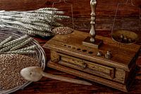 antieke schubben met tarwe-oren op houten achtergrond, studiofotografie