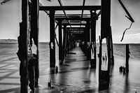 oude steiger aan de rand van een renbaan langzaam defragementerend in de zee.