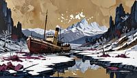 Oude stoomboot in besneeuwde bergen in de winter