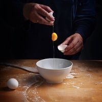 oudere vrouwenhanden breken een ei met vallende eierdooier over een kom, houten keukenplank, donkere achtergrond met kopieerruimte, geselecteerde focus