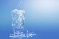 het gieten van water in een waterglas, fonkelend water koud en duidelijk tegen een blauwe achtergrond, zon abstract, verfrissende waterspatten en waterdalingen