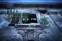 oorlogsrestanten in Kroatie. Door oorlog verwoest hotel in Kapari Beach. Desolate sfeer in verlaten hotel. Overwoekerd raam van verlaten hotel . De Natuur neemt terug. Urbex