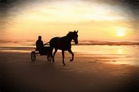 Een strandrit tijdens een zonsondergang met paard en sulky