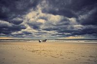 Een ruiter snelt met paard en sulky over het strand, een vergezicht met de Noordzee en het strand. in de winter met een weids uitzicht Paardrijden met sulky op het strand. Een leeg strand alleen ruiter met paard langs de vloedlijn. Het Noordzeestrand, gehuld in mystiek vormt het decor voor een onvergetelijk tafereel. Een sulky, voortgetrokken door een krachtig paard, beweegt zich gracieus over het zand. Donkere wolken aan de hemel voegen een vleugje dramatiek toe aan het geheel. Het contrast tussen licht en schaduw creëert een visueel spel dat de diepte en beweging benadrukt. Het ritme van de paardenhoeven vermengt zich met het geruis van de branding, terwijl de wind speelt met de manen van de paarden en de haren van de rijder. Dit beeld vertelt een verhaal van verbinding tussen mens, dier en natuur, waar kracht en sereniteit elkaar ontmoeten. De beeld laat de emotie en energie van het moment sprankelen, terwijl de donkere wolken een gevoel van avontuur en onvoorspelbaarheid toevoegen. Het Noordzeestrand met paardrijden en sulky wordt een tijdloze kunstuiting.