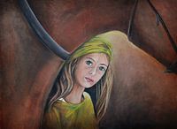 Olieverfschilderij van een meisje wat ik jaren geleden heb gefotografeerd op een evenement van ringrijden in Zeeland.. de blik in haar ogen deed me iets, het leek of ze stond te schuilen onder dit sterke Zeeuwse trekpaard.