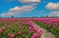 paarse tulpen van onderaf gefotografeerd met een blauwe lucht.