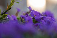 close up van het paarse bloemetje van een lentebloeiende bodembedekker, met het warme licht van de opkomende zon op de achtergrond