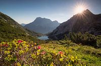 paarse rododendron die in de bergen bloeit bij de zomerzonsopgang