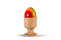 Een kleurrijk paasei in een houten eierdopje op een witte achtergrond