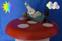 In sprookjesland is alles mogelijk,deze kabouter ligt heerlijk te chillen op zijn dakterras. De sprookjeszon en de sprookjeswolken maken het plaatje compleet.