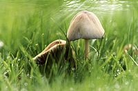 Paddenstoelen zo groot (of zo klein) als een grasspriet. De zonnestralen en de druppels geven een speciale sfeer aan dit stukje natuur.