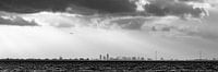 Amsterdam aan de horizon over het water in zwart wit de skyline van Amsterdam is goed te zien over het gooimeer.