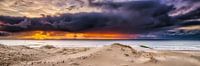 Een beeld in panorama met zicht op het strand en de Noordzee bij een zonsondergang. De Hollandse kustlijn in panorama op de voorgrond een stuk duin.
