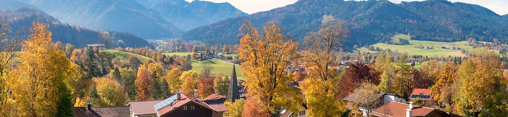 prachtig panoramisch landschap in oktober, uitkijkplaats met bank bij Fischbachau, Opper-Beieren.