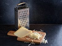 parmezaanse kaas aan stukken en geraspt en een gebruikte metalen rasp op een houten snijplank tegen van Maren Winter