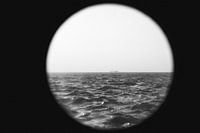 foto van een patrijspoorten op een schip, het kan ook op een perioscope lijken doordat de opnamen laag op het water gemaakt is. zwart wit.