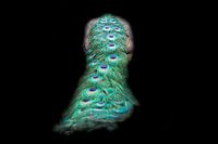 Een prachtig uitzicht op de mooie veren van een mannelijke pauw. De veren draperen over de grond wat zorgt voor een artistiek beeld.