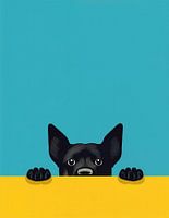 Een minimalistisch behang in een plat ontwerp toont een schattige zwarte hond die nieuwsgierig van onderaf naar boven spiekt. De achtergrond is een heldere, zonnige blauwe kleur, wat een vrolijke sfeer creëert. De voorgrond, in een contrasterend geel, laat slechts een klein deel van de hond zien, net genoeg om zijn nieuwsgierige ogen en een stukje van zijn kop te laten opvallen. De combinatie van de felle kleuren en het eenvoudige, maar speelse ontwerp zorgt voor een vrolijke en moderne uitstraling, perfect voor een eigentijds interieur.