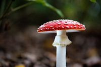close up van een perfecte vliegenzwam, rood met witte stippen, met op de achtergrond het bos