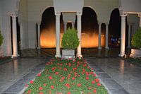 Groene plant aan het einde van de zaal met aan zijn voeten een prachtige veld met rode bloemen en in zijn achtergrond een vuur effect