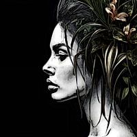 Vrouw, vrouwengezicht in zwart wit met groene planten in het haar
