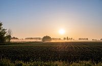 landschap in Homoet, Overbetuwe in Gelderland, met zicht op de akker met een laagje grondmist, en de zon die opkomt in een blauwe hemel