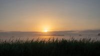 landschap in Homoet, Overbetuwe, Gelderland, met zicht op grassen langs rivier de Linge, en een mistige zonsopkomst op de achtergrond