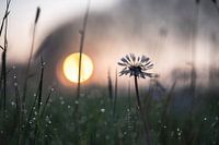 close up van een uitgebloeide paardenbloem tussen de grassprietjes die bedekt zijn met dauwdruppels, met een nevelige zonsopkomst op de achtergrond