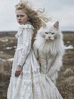 prachtig meisje met mooie witte flyffy kat muurkunst
