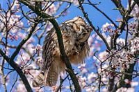 Poetsende ransuil op een roestplek. Er zaten er 8 in deze boom vol met bloesem. Wat een gelukje om ze daar te treffen/