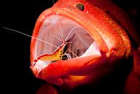 Een poetsgarnaal staat klaar om de bek van een baars te ontdoen van bacteriën en parasieten. Dat gebeurt in een onderwater- poetstation. Seraya, Bali, Indonesië.
