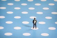 Deze miniatuur accordeonist speelt de polka en staat met stip op de polka dot.
