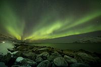 Prachtig noorderlicht, ook wel poollicht of aurora borealis genoemd, boven de fjorden van noord Noorwegen. Reflecties in het zeewater, maakt het een oogverblindend schouwspel.