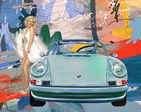 Schilderij van een Porsche met Monroe erbij afgebeeld. Dit schilderij kan in de woonkamer of natuurlijk goed geschikt voor de kunst voor in een mancave.