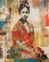 Moderne collage, portret van een jonge, Aziatische vrouw. Dit is een digitaal vervaardigde collage waarbij tekentechnieken, schildertechnieken en collagetechnieken gebruikt zijn. Het heeft zowel een moderne als vintage uitstraling, erg mooi aan je muur!