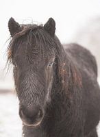close up van een donkerbruine pony die in een besneeuwd weiland in Heteren langs de Rijn staat, met een mistige achtergrond